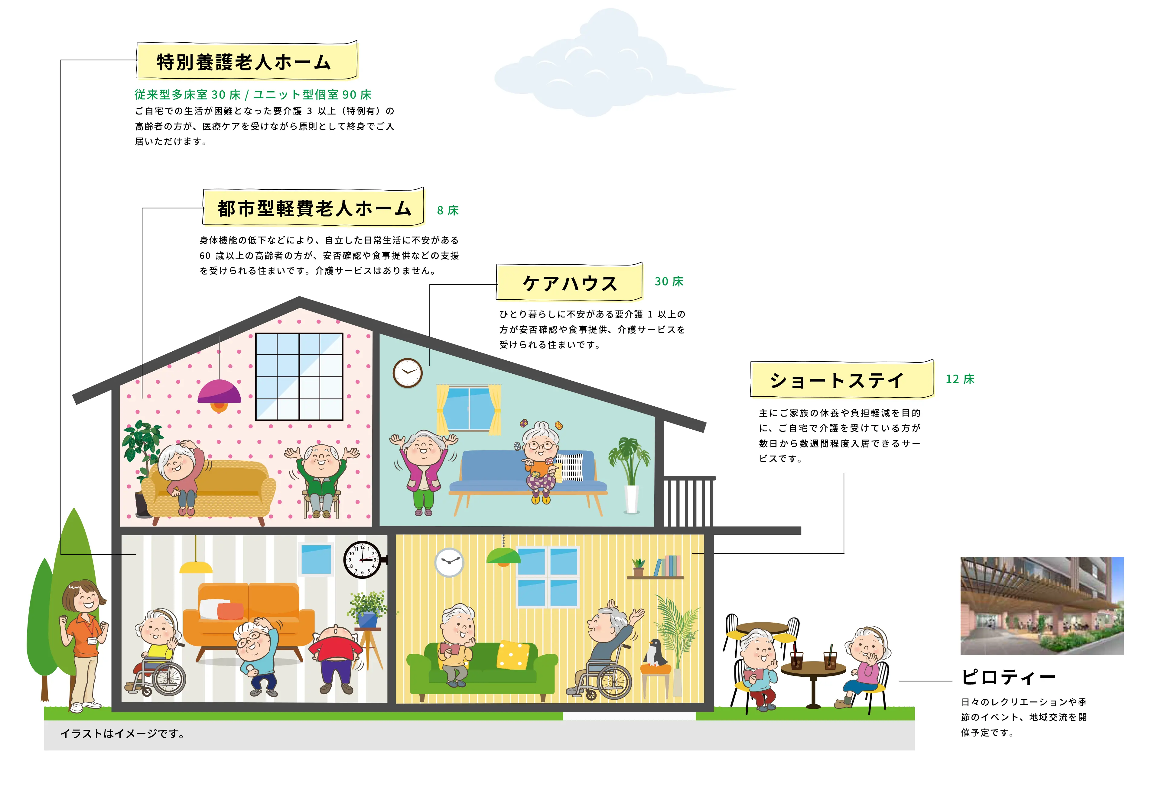 タムスさくらの杜 亀戸とは、従来型多床室30床、ユニット型個室90床、ショートステイ12床、ケアハウス30床/都市型軽費老人ホーム8床の施設です。